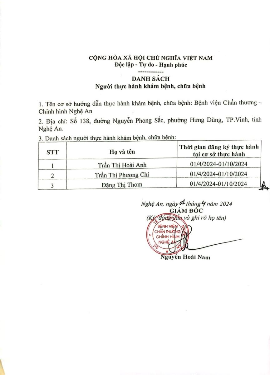 Danh sách người thực hành khám chữa bệnh tại Bệnh viện Chấn thương - Chỉnh hình Nghệ An như sau: