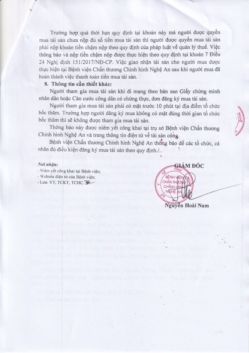 Thông báo về việc bán thanh lý vật liệu thu hồi từ việc phá dỡ nhà chứa rác thải Bệnh viện Chấn thương Chỉnh hình Nghệ An theo hình thức bán chỉ định